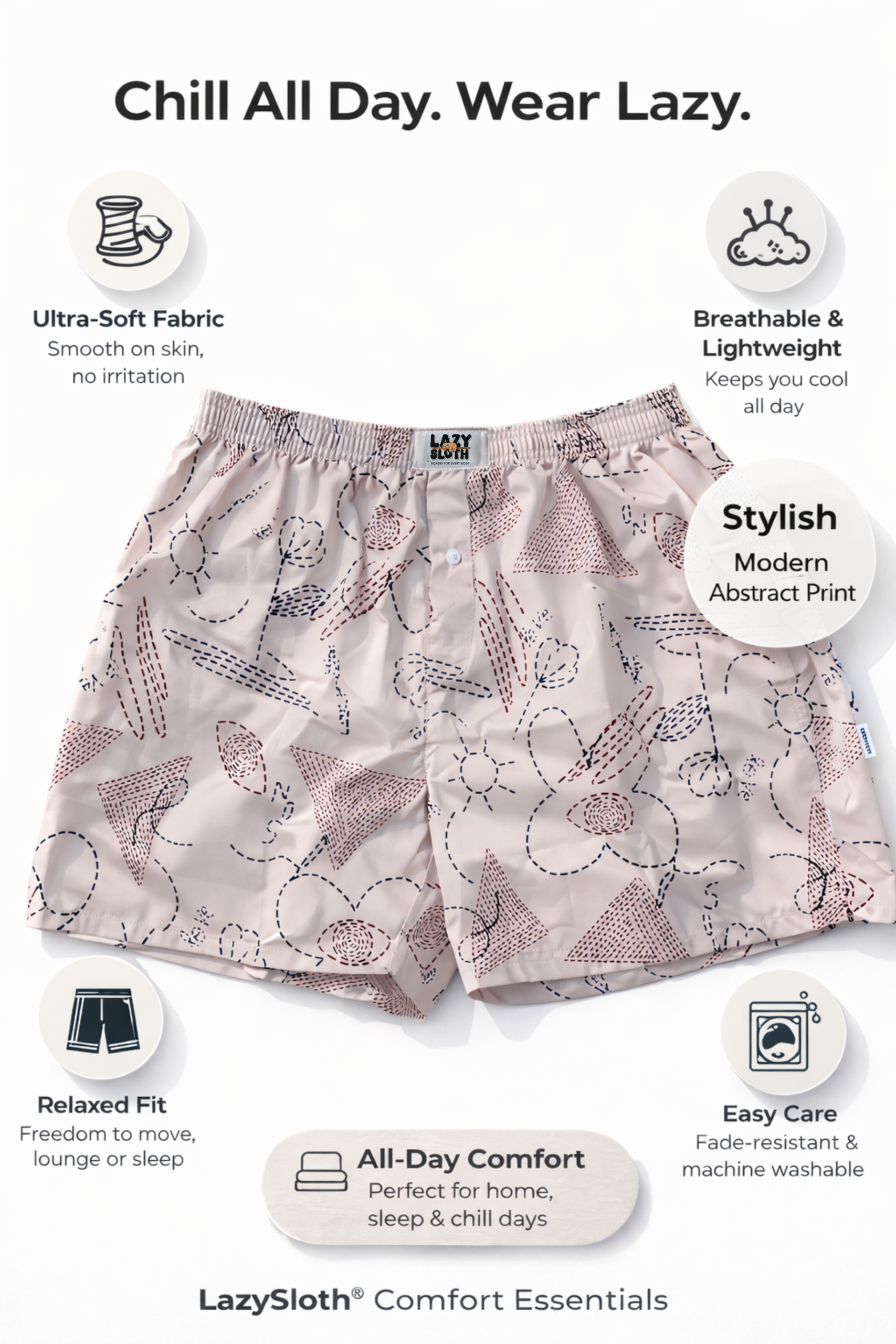 Meet Day Dreamer — boxers designed for slow mornings, late nights, and laid-back days. Crafted from soft, breathable cotton with a relaxed fit, they feel light on the skin and easy to wear. The subtle all-over print adds just enough character, making these boxers perfect for lounging, sleeping, or doing absolutely nothing in comfort.